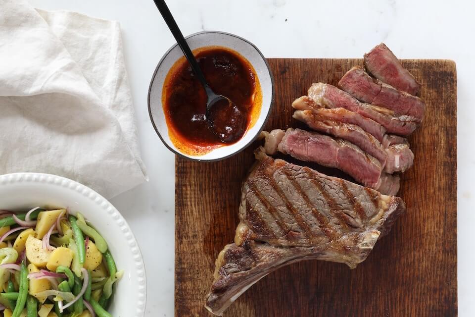 Our Spiced Butter drizzled over this steak is outstanding. Clarified, so it’s pure savory fat without the sweet cream of dairy, the hot butter sizzles the just-right balance of sweet paprika to hot smoky pimentón. It’s a super-easy five-ingredient finish that takes the Spanish Basque classic of grilled ribeye over the top.