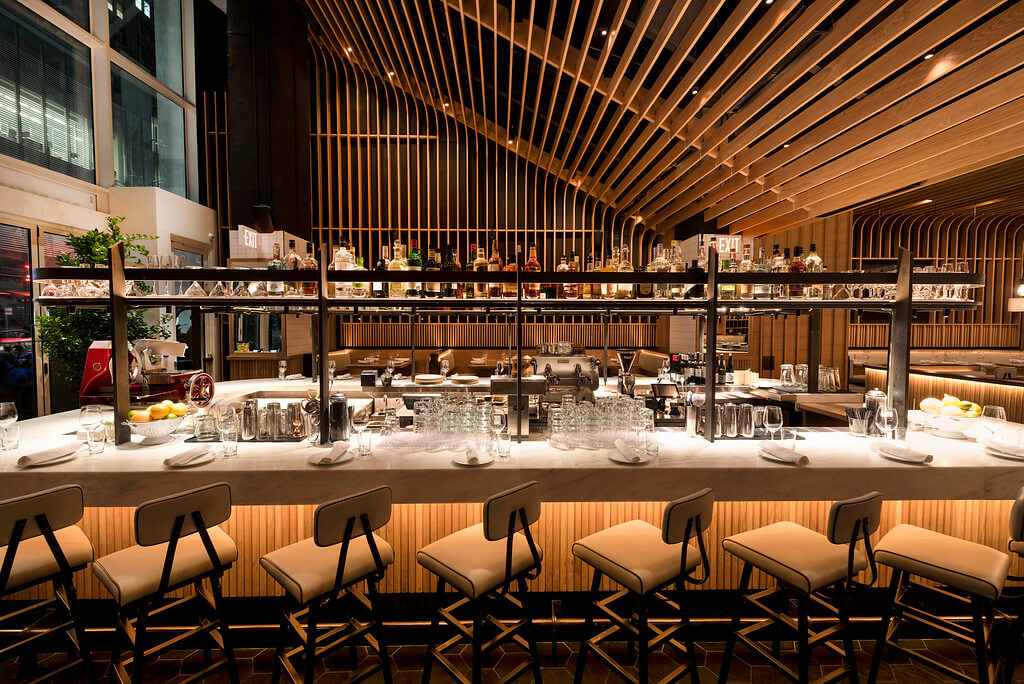 “Distinguished by a handsome curved wood ceiling that soars near the entrance, it seats nearly 100 at a generous island bar surrounded by booths with more tables beyond, heading to the big open kitchen. There’s also a chef’s table, an intimate private dining room with shelves of Spanish grocery products, and outdoor seating for 20.”