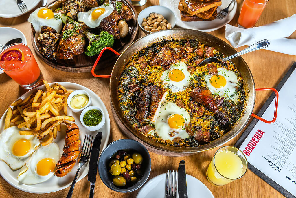 “Tapas make for a perfect boozy brunch affair. Eat a little. Drink a little. Repeat. At Boqueria’s four (Flatiron, UES, Soho and Garment District) locations across the city, you can order from a brunch menu ($42), which includes favorites like pan con tomate and patatas bravas and even a decadent brunch paella topped with fried eggs.”