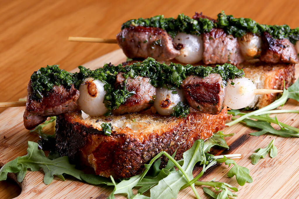 “I like grilling lamb in the springtime, as it’s a bit more unexpected,” says Chef Marc Vidal of Boqueria. At the restaurant, their pintxos morunos—grilled spiced lamb skewers—are very popular and with good reason: “I marinate boneless lamb top rounds for two days with toasted cumin, coriander, fennel, onion, pimenton, and lemon and serve them with pickled shallots and salsa verde,” he says. “The acidity and freshness of the dish is perfect for warm weather grilling, and the skewers make great small bites for a cookout.”
