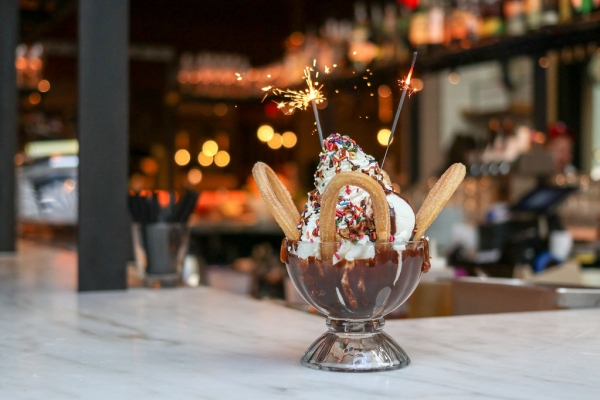 “This New York City restaurant’s Churro Sundae features four fresh churros, accompanied by vanilla ice cream, chocolate sauce, sprinkles, toasted walnuts, whipped cream, and flaming (yes, flaming) sparklers.”