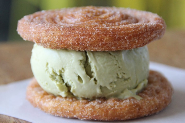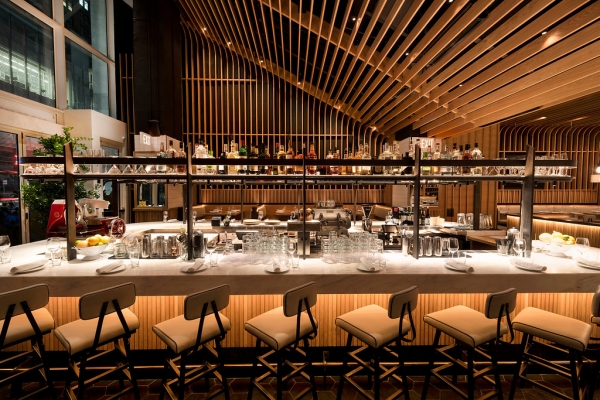 “Distinguished by a handsome curved wood ceiling that soars near the entrance, it seats nearly 100 at a generous island bar surrounded by booths with more tables beyond, heading to the big open kitchen.
