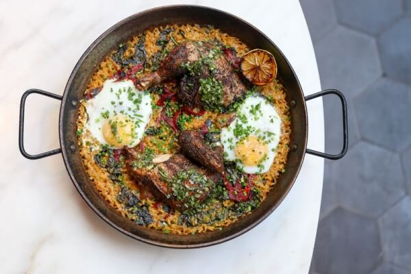 “In coastal parts of Spain, paella is often finished with fresh shellfish, unsurprisingly, but access to ingredients and local tastes often dictate the finished product as in Boqueria’s (New York) massive “brunch paella” with chicken confit, pork belly, and sauteed kale topped with fried eggs.”
